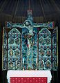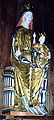 The soapstone baptismal font, with its conical wooden lid, is of gothic style and is still in use. On a special mount on the wall of the church is a statue of the Virgin Mary, crowned and dressed in a golden robe lined with vair and holding the similarly crowned and robed Christ Child enthroned on her lap. The statue dates from the early 13th century as does the wooden tabernacle in the form of a church. Hedal church was originally dedicated to the Virgin Mary and this statue originally stood on the principal altar in the apse in front of a polytych painted with scenes of her life, which could be closed over it during times of fasting. This polytych was repainted in the Baroque period and now forms the altarpiece, in front of which is displayed a medieval crucifix of Christ on the cross in the shape of a stylized tree of life. Both the statue of the Virgin and Child and the crucifix are among the more beautiful works of medieval art to survive from the Norwegian Middle Ages.[11]