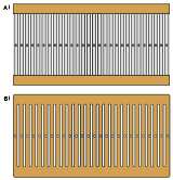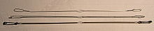 There are three common types of metal heddles: wire, inserted eye, and flat steel. The inserted eye are considered to be the best, as they have a smooth eye with no rough ends to catch the warp. Wire heddles are second in quality, followed by the flat steel. Wire heddles look much like the inserted eye heddles, but where in the inserted eye there is a circle of metal for the eye, the wire ones are simply twisted at the top and bottom. The flat metal heddles are considered the poorest in quality as they are heavier and bulkier, as well as not being as smooth. They are a flat piece of steel, with the ends rotated slightly so that the flat side is at an angle of 45 degrees to the shaft. The eye is simply a hole cut in the middle of the piece of metal.