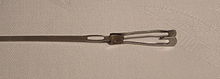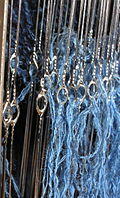 A heddle is an integral part of a loom. Each thread in the warp passes through a heddle,[1] which is used to separate the warp threads for the passage of the weft.[1][2] The typical heddle is made of cord or wire and is suspended on a shaft of a loom. Each heddle has an eye in the center where the warp is threaded through.[3] As there is one heddle for each thread of the warp, there can be near a thousand heddles used for fine or wide warps. A handwoven tea-towel will generally have between 300 and 400 warp threads[4] and thus use that many heddles.