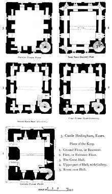 The keep has five floors including the Great or Banqueting Hall with a great fireplace and a central arch extending two stories. The top floor may have been added around the 15th century, replacing an impressive pyramid-shaped roof.[6] This is a recent theory, however, and many older sources have noted the similar plans of Hedingham Castle and Rochester Castle, which was begun about 1126 and has four floors and four turrets.