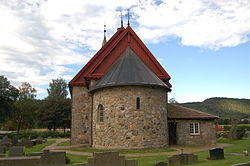 Hedrum Church was built of stone around 1100 and has 260 seats. The church celebrated its 950-year anniversary in 2010. The church has a rectangular nave, square choir and apse. Building Archaeological studies show that the apse is added later. The structure was extended by four meters in 1666 . The west part with the portal and door openings are from after the Reformation. Hedrum Church has a number of tombstones, which cover large parts of the floor of the church. Hedrum Church cemetery is clearly visible from traffic arteries on both sides of Numedalslågen. Some of the graves are believed to pre-date the introduction of Christianity confirming the supposition that ancient pagan cult sites were chosen as the venue for the earlier churches. [2]