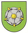 Hefersweiler itself bore no arms before the amalgamation of the two centres of Hefersweiler and Berzweiler. Thus, the current coat of arms applies to the municipality as a whole. The charge above the wavy fess is drawn from an earlier court seal. The arms have been borne since 1975 when they were approved by the now defunct Rheinhessen-Pfalz Regierungsbezirk administration in Neustadt an der Weinstraße. Before amalgamation, Berzweiler bore its own arms. They were vert a rose argent seeded and barbed Or (see illustration). It likewise was drawn from an earlier seal. These arms were never approved by any higher authority.[18]