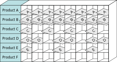 A typical heijunka box has horizontal rows for each product. It has vertical columns for identical time intervals of production. In the illustration on the right, the time interval is thirty minutes. Production control kanban are placed in the pigeon-holes provided by the box in proportion to the number of items to be built of a given product type during a time interval.