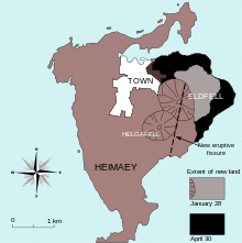 The encroaching lava flow threatened to destroy the harbour. The eruption lasted until 3 July. Townspeople constantly sprayed the lava with cold seawater, causing some to solidify and much to be diverted, thus saving the harbour.[3] The people were elated that their livelihoods remained intact, even though much of their town was destroyed. During the eruption, half of the town was crushed and the island expanded in length. The eruption increased the area of Heimaey from 11.2 km2 (4.3 sq mi) to 13.44 km2 (5.19 sq mi). Only one man died in the eruption.[4][5] The eruption is described by John McPhee in his book The Control of Nature.[5]