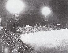 When the umpire agreed and called the game after the fourth inning, fans stormed the field and attacked the umpire and the Orions.[6] Nishitetsu players such as Noguchi Masaaki and Hiroshi Oshita helped to defend Kaoru Betto and the other Orion players against the assault.[4] Yuasa attempted to defuse the situation by apologizing over the PA system.[6] Eventually, the team managed to get out of the stadium with the help of a police escort.[4][6] In addition to police, the U.S. Army in Fukuoka was also mobilized and the chaos wasn't contained until midnight.[4] The event received media attention throughout Japan and thrust Heiwadai Stadium into the national spotlight.[7] In the aftermath, Yuasa was later dismissed as manager on July 27. In response to this incident,[6] Nishitstsu applied for and received approval from Fukuoka to install lights in 1954. Heiwadai Stadium's first night game feature the Lions competeing against the Nankai Hawks on June 2, 1954.[3]