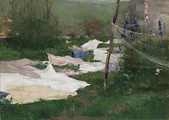 After spending a year in Finland, Schjerfbeck travelled again to Paris in the autumn of 1886. Schjerfbeck was given more money to travel by a man from the Finnish Art Society and in 1887 she travelled to St Ives, Cornwall, in Britain.[1] There she painted The Bakery (1887) and The Convalescent, the latter winning the bronze medal at the 1889 Paris World Fair. The painting was later bought by the Finnish Art Society. During this period Schjerfbeck was painting in a naturalistic plein-air style.