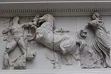 The island of Rhodes was an important cult center for Helios, one of the only places where he was worshipped as a major deity in ancient Greece.[25] The worship of Helios at Rhodes included a ritual in which a quadriga, or chariot drawn by four horses, was driven over a precipice into the sea, in reenactment to the myth of Phaethon. Annual gymnastic tournaments were held in Helios' honor. The Colossus of Rhodes was dedicated to him. The Rhodians called shrine of Helios, Haleion (Ancient Greek: Ἄλειον).[26] Athenaeus also mentions that the Rhodians celebrated a festival, the Halieia, in his honour.[27] Helios also had a significant cult on the acropolis of Corinth on the Greek mainland.[28]