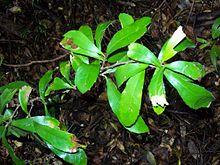 They grow naturally across the Malesia region with the major centre of species diversity of about fifty species in New Guinea. They grow naturally in the south west Pacific ocean region, and in north and eastern Australia. They grow naturally across southern and eastern Asia, including Indonesia, Malaysia and another centre of species diversity of about twenty species in southern China, extending to parts of the Indian subcontinent, the Philippines, Taiwan, and southern Japan.[16][21][24] The plant family Proteaceae's 1,700 species (approximate) have their greatest diversity in the southern hemisphere and smaller centres of diversity including some Helicia, in the near northern hemisphere. The species diversity of the plant family Proteaceae decreases further northwards. H. cochinchinensis has the natural distribution reaching furthest north to Japan where it grows into trees in the mountains of warmer parts and where no other species nor other Proteaceae genera occur. The same Japanese name Yama-mogashi (山もがし) for this species, also means the whole genus and the entire Proteaceae plant family.[29] In the New Guinea and southern China centres of species diversity, many species grow in forests, up to as tall as the sub-canopy, especially diverse in rainforests.[21][24] In Australia, they are generally components of rainforests, and prefer richer soils,[28] especially in the farthest south region of Helicia's global distribution, the Illawarra, New South Wales, south of Sydney, where only one species H. glabriflora occurs, preferring richer basalt soils.[30][31]