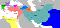 The vast Seleucid Empire was, like Egypt, mostly dominated by a Greco-Macedonian political elite.[59][61][62][63] The Greek population of the cities who formed the dominant elite were reinforced by emigration from Greece.[59][61] These cities included newly founded colonies such as Antioch, the other cities of the Syrian tetrapolis, Seleucia (north of Babylon) and Dura-Europos on the Euphrates. These cities retained traditional Greek city state institutions such as assemblies, councils and elected magistrates, but this was a facade for they were always controlled by the royal Seleucid officials. Apart from these cities, there were also a large number of Seleucid garrisons (choria), military colonies (katoikiai) and Greek villages (komai) which the Seleucids planted throughout the empire to cement their rule. This 'Greco-Macedonian' population (which also included the sons of settlers who had married local women) could make up a phalanx of 35,000 men (out of a total Seleucid army of 80,000) during the reign of Antiochus III. The rest of the army was made up of native troops.[64] Antiochus III ("the Great") conducted several vigorous campaigns to retake all the lost provinces of the empire since the death of Seleucus I. After being defeated by Ptolemy IV's forces at Raphia (217 BC), Antiochus III led a long campaign to the east to subdue the far eastern breakaway provinces (212–205 BC) including Bactria, Parthia, Ariana, Sogdiana, Gedrosia and Drangiana. He was successful, bringing back most of these provinces into at least nominal vassalage and receiving tribute from their rulers.[65] After the death of Ptolemy IV (204 BC), Antiochus took advantage of the weakness of Egypt to conquer Coele-Syria in the fifth Syrian war (202–195 BC).[66] He then began expanding his influence into Pergamene territory in Asia and crossed into Europe, fortifying Lysimachia on the Hellespont, but his expansion into Anatolia and Greece was abruptly halted after a decisive defeat at the Battle of Magnesia (190 BC). In the Treaty of Apamea which ended the war, Antiochus lost all of his territories in Anatolia west of the Taurus and was forced to pay a large indemnity of 15,000 talents.[67]