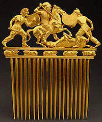 The Odrysian Kingdom was a union of Thracian tribes under the kings of the powerful Odrysian tribe centered around the region of Thrace. Various parts of Thrace were under Macedonian rule under Philip II of Macedon, Alexander the Great, Lysimachus, Ptolemy II, and Philip V but were also often ruled by their own kings. The Thracians and Agrianes were widely used by Alexander as peltasts and light cavalry, forming about one fifth of his army.[37] The Diadochi also used Thracian mercenaries in their armies and they were also used as colonists. The Odrysians used Greek as the language of administration[38] and of the nobility. The nobility also adopted Greek fashions in dress, ornament and military equipment, spreading it to the other tribes.[39] Thracian kings were among the first to be Hellenized.[40]