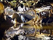 Helm's Deep is properly the narrow gorge or ravine[T 2][T 3] at the head of a larger valley (the Deeping-coomb), but the name is also used for the fortifications at the mouth of the gorge and the larger valley below.[T 4][T 5][T 6] The gorge, which wound deep into the White Mountains at the feet of the Thrihyrne mountain, led into the Glittering Caves of Aglarond, an extensive series of spectacular speleothems. In The Lord of the Rings, the Dwarf Gimli, who like all dwarves is well versed in geology, horrified that the caves are used only as a refuge, describes them lyrically: