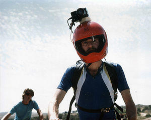 Another early innovator of video helmet camera technology was Mark Schulze, who created a system for use while producing The Great Mountain Biking Video in 1987.[6][7][8][9] "Schulze stripped-down a red motorcycle helmet and jury-rigged a mounting for the first consumer color video chip camera. A cable ran from the camera to a padded backpack that contained a Panasonic VHS portable video recorder and a DC-lead-acid battery for power, which made the rig heavy, unwieldy, and hot.[10]