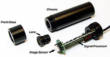 Helmet cameras generally fall into two main categories; CMOS and CCD type. Although helmet cameras take on a variety of forms, the majority are small cylindrical cameras resembling a tube of lipstick or a bullet. Helmet cameras may be connected to a video recording device with video input capability, such as a handheld camcorder, or purpose built digital video recorder.[20]
