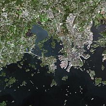 The Helsinki Metropolitan Area (Greater Helsinki) consists of the cities of Helsinki Capital Region and ten surrounding municipalities: Hyvinkää, Järvenpää, Kerava, Kirkkonummi, Nurmijärvi, Sipoo, Tuusula, Pornainen, Mäntsälä and Vihti.[35] The Metropolitan Area covers 3,697 square kilometres (1,427 sq mi) and has a population of over 1.4 million, or about a fourth of the total population of Finland. The metropolitan area has a high concentration of employment: approximately 750,000 jobs.[36] Despite the intensity of land use, the region also has large recreational areas and green spaces. The Greater Helsinki area is the world's northernmost urban area with a population of over one million people, and the northernmost EU capital city.