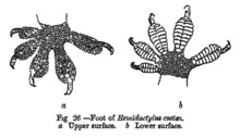 The fingers and toes are free, or more or less webbed, and dilated; underneath they bear two rows of lamellae in a pattern resembling a paripinnate compound leaf.[4] This leads to their other and more ambiguous common name, "leaf-toed geckos", used mainly for species from South Asia and its surroundings to prevent confusion with the many "leaf-toed" Gekkota not in Hemidactylus.