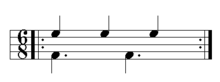 In rhythm, hemiola refers to three beats of equal value in the time normally occupied by two beats.[7]