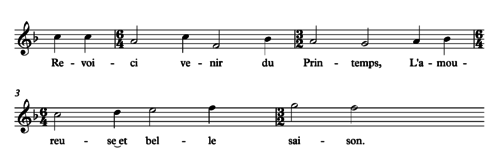 Hemiola is found in many Renaissance pieces in triple rhythm. One composer who exploited this characteristic was the 16th-century French composer Claude Le Jeune, a leading exponent of musique mesurée à l'antique. One of his best-known chansons is "Revoici venir du printemps" , where the alternation of compound-duple and simple-triple metres with a common counting unit for the beat subdivisions can be clearly heard: