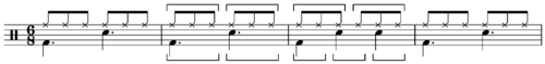 This figure is a common African bell pattern, used by the Hausa people of Nigeria, in Haitian Vodou drumming, Cuban palo, and many other drumming systems. The figure is also used in many sub-varieties of the Flamenco genre (bulerías, for example), and in various popular Latin American musics.. It is also a fundamental feature of the Czech furiant dance form, familiar from the two examples in Dvořák's Slavonic Dances Op. 48. The horizontal hemiola suggests metric modulation (6