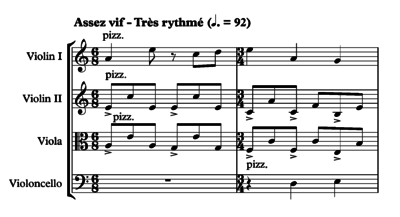 At the beginning of the second movement, Assez vif – très rythmé, of his String Quartet (1903), Ravel "uses the pizzicato as a vehicle for rhythmic interplay between 6