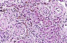 It is only found within cells (as opposed to circulating in blood) and appears to be a complex of ferritin, denatured ferritin and other material.[4][5] The iron within deposits of hemosiderin is very poorly available to supply iron when needed. Hemosiderin can be identified histologically with Perls' Prussian blue stain; iron in hemosiderin turns blue to black when exposed to potassium ferrocyanide.[6] In normal animals, hemosiderin deposits are small and commonly inapparent without special stains. Excessive accumulation of hemosiderin is usually detected within cells of the mononuclear phagocyte system (MPS) or occasionally within epithelial cells of liver and kidney.