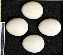 The nest is built on the ground or on a mound of dirt or vegetation. Nests are made of sticks and are lined inside with grass and leaves. Four to eight (exceptionally 2 to 10) whitish eggs are laid. The eggs measure approximately 47 mm × 36 mm (1.9 in × 1.4 in). The eggs are incubated mostly by the female for 31 to 32 days. When incubating eggs, the female sits on the nest while the male hunts and brings food to her and the chicks. The male will help feed chicks after they hatch, but does not usually watch them for a greater period of time than around 5 minutes.[10] The male usually passes off food to the female, which she then feeds to the young, although later the female will capture food and simply drop into the nest for her nestlings to eat. The chicks fledge at around 36 days old, though breeding maturity is not reached until 2 years in females and 3 years in males.