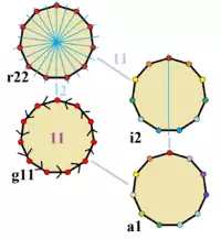 These 4 symmetries can be seen in 4 distinct symmetries on the hendecagon. John Conway labels these by a letter and group order.[11] Full symmetry of the regular form is r22 and no symmetry is labeled a1. The dihedral symmetries are divided depending on whether they pass through vertices (d for diagonal) or edges (p for perpendiculars), and i when reflection lines path through both edges and vertices. Cyclic symmetries in the middle column are labeled as g for their central gyration orders.