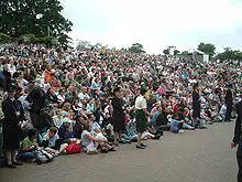 Aorangi Terrace, commonly known as "Murray Mount", alongside a series of other nicknames,[1] is a mostly grassed banked area in the grounds of the All England Lawn Tennis and Croquet Club where, during the annual Wimbledon tennis championship, crowds of people without showcourt tickets can watch the tennis matches live on a giant television screen at the side of No. 1 Court. The terrace is also the main site for spectators to eat picnics.[1] During television broadcasts of matches, cameras often sweep over the area, and sports journalists frequently conduct vox pops and interviews with members of the crowd.