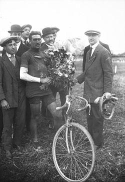 Henri Pélissier first rode a bicycle when he was eleven, because he needed to get rid of his energy. When he was 15 years old, he rode his first race, a track race that was meant for 17-year-olds.[4] Henri Pélissier was so thin as a young man that friends called him Ficelle, after France's thinnest loaf of bread. The word also means "string". One of four brothers, three of whom became professional cyclists, he was by far the strongest. He also became known for a stubborn, difficult personality which had led his father to banish him from the family farm when he was 16. In the next years, Henri Pélissier rode a few small road races, but it was not until 1908 when he started to ride seriously as an amateur. By 1910, he had established his name as a competent rider, and in 1911, 22 years old, he got a professional licence.[4]