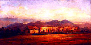 In 1875, he settled in Santa Barbara, California, where he would live out his days. Ford traveled by horse and buggy to each of the twenty-one Spanish missions in California, where he created a historically important portfolio of watercolors, oils, and etchings.[1] His depictions of the missions were (in part) responsible for the revival of interest in the state's Spanish heritage, and indirectly for the restoration of the missions themselves. In 1883, Ford published his Etchings of the Franciscan Missions of California, and exhibited his works at the 1893 Chicago World's Fair. The hallmarks of Ford’s images are exquisite brushwork and tonal mastery in all mediums, which make his works highly prized. Ford died in 1894 in Santa Barbara.