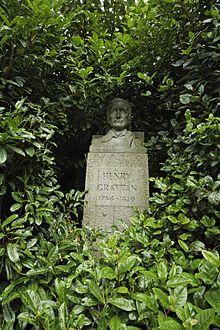 In the following summer, after crossing from Ireland to Britain when in poor health to bring forward the Irish question once more, he became seriously ill. On his death-bed he spoke generously of Castlereagh, and with warm eulogy of his former rival, Flood. He died at his home in Portman Square on 4 June 1820,[5] and was buried in Westminster Abbey close to the tombs of Pitt and Fox. His statue is in the Outer Lobby of the Palace of Westminster.