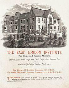 In March 1873 Henry and wife Fanny started the famous East London Missionary Training Institute (also called Harley College) at Harley House in Bromley-by-Bow, East End of London with just six students. The renowned Dr. Thomas Barnardo was co-director with Dr. Guinness and greatly influenced by him. The school trained 1330 missionaries for 30 societies of 30 denominations.