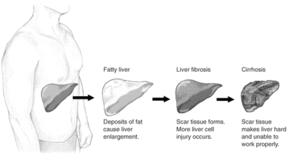 In the early stages (as with NAFLD and early NASH), most patients are asymptomatic or have mild right upper quadrant pain, and diagnosis is suspected on the basis of abnormal liver function tests.[29] As the disease progresses, symptoms typical of chronic hepatitis may develop.[41] While imaging can show fatty liver, only liver biopsy can demonstrate inflammation and fibrosis characteristic of NASH.[42] 9 to 25% of patients with NASH develop cirrhosis.[29] NASH is recognized as the third most common cause of liver disease in the United States.[41]