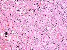 Histopathology of acute hepatitis with lobular disarray and associated lymphocytic inflammation, acidophil body formation (arrow) and bilirubinostasis.