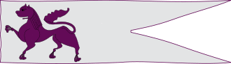 The Scots guidon is similar in shape to the standard and pennon. At 6.5' long, it is smaller than the standard and twice the size of the pennon. Guidons are assigned by the Lord Lyon to those individuals who qualify for a grant of supporters to their Arms and to other individuals who have a following such as individuals who occupy a position of leadership or a long-term official position commanding the loyalty of more than a handful of people. The Guidon tapers to a round, unsplit end at the fly.[3]