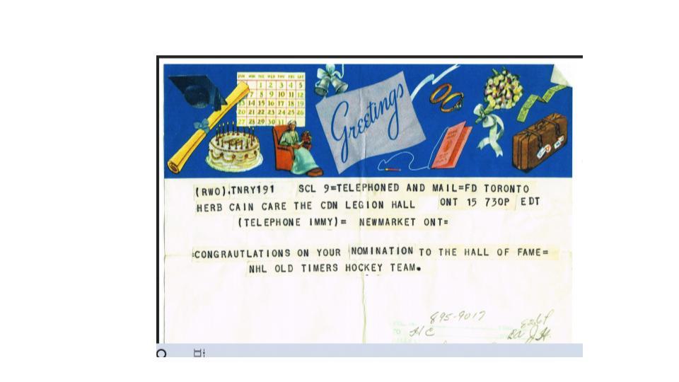 The reason Herb Cain is not in the Hall of Fame is known only to board members who considered or did not consider his eligibility. In 2007, Red Fisher, a sports writer for the Montreal Gazette and long time member of the Hockey Hall of Fame selection committee is quoted as saying that Cain's name never came up, although when a benefit was held for Cain in the Legion Hall in Newmarket, Ontario on December 16, 1964 [57] when Herb was recovering from cancer, he received a telegram including the following. "CONGRATULATIONS ON YOUR NOMINATION TO THE HOCKEY HALL OF FAME. NHL OLD TIMERS HOCKEY TEAM." [58] And fittingly, Herb Cain's friends on the Hockey Old Timers[59] played in the Newmarket Memorial Area that afternoon.