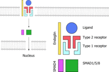 All genes known so far to be linked to HHT code for proteins in the TGF-β signaling pathway. This is a group of proteins that participates in signal transduction of hormones of the transforming growth factor beta superfamily (the transforming growth factor beta, bone morphogenetic protein and growth differentiation factor classes), specifically BMP9/GDF2 and BMP10. The hormones do not enter the cell but link to receptors on the cell membrane; these then activate other proteins, eventually influencing cellular behavior in a number of ways such as cellular survival, proliferation (increasing in number) and differentiation (becoming more specialized).[1] For the hormone signal to be adequately transduced, a combination of proteins is needed: two each of two types of serine/threonine-specific kinase type membrane receptors and endoglin. When bound to the hormone, the type II receptor proteins phosphorylate (transfer phosphate) onto type I receptor proteins (of which Alk-1 is one), which in turn phosphorylate a complex of SMAD proteins (chiefly SMAD1, SMAD5 and SMAD8). These bind to SMAD4 and migrate to the cell nucleus where they act as transcription factors and participate in the transcription of particular genes. In addition to the SMAD pathway, the membrane receptors also act on the MAPK pathway, which has additional actions on the behavior of cells.[2] Both Alk-1 and endoglin are expressed predominantly in endothelium, perhaps explaining why HHT-causing mutations in these proteins lead predominantly to blood vessel problems.[2][8] Both ENG and ACVRL1 mutations lead predominantly to underproduction of the related proteins, rather than misfunctioning of the proteins.[8]
