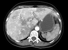Liver AVMs may be suspected because of abnormal liver function tests in the blood, because the symptoms of heart failure develop, or because of jaundice or other symptoms of liver dysfunction. The most reliable initial screening test is Doppler ultrasonography of the liver; this has a very high sensitivity for identifying vascular lesions in the liver. If necessary, contrast-enhanced CT may be used to further characterize AVMs.[1][2][6] It is extremely common to find incidental nodules on liver scans, most commonly due to focal nodular hyperplasia (FNH), as these are a hundredfold times more common in HHT compared to the general population. FNH is regarded as harmless. Generally, tumor markers and additional imaging modalities are used to differentiate between FNH and malignant tumors of the liver. Liver biopsy is discouraged in people with HHT as the risk of hemorrhage from liver AVMs may be significant.[6][7] Liver scans may be useful if someone is suspected of HHT, but does not meet the criteria (see below) unless liver lesions can be demonstrated.[7]