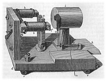 In 1849, while at Königsberg, Helmholtz measured the speed at which the signal is carried along a nerve fibre. At that time most people believed that nerve signals passed along nerves immeasurably fast.[9] He used a recently dissected sciatic nerve of a frog and the calf muscle to which it attached. He used a galvanometer as a sensitive timing device, attaching a mirror to the needle to reflect a light beam across the room to a scale which gave much greater sensitivity.[9] Helmholtz reported[10][11] transmission speeds in the range of 24.6 - 38.4 meters per second.[9]