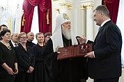 For "his outstanding historical role in the establishment of the independent Orthodox Church of Ukraine, activities aimed at reviving the spirituality of the Ukrainian people, raising the authority of Orthodoxy, establishing ideals of mercy and interfaith harmony" and because he "was, is and remains the spiritual leader of the Ukrainian church, the spiritual leader of the Ukrainian people",[23][24] Patriarch Filaret received the award on 8 January 2019.[25] On 22 January, on the Ukrainian Unity Day, President Petro Poroshenko handed the medal to Filaret.[26][27]