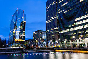 Three skyscrapers dominate the area: 25 Bank Street, 40 Bank Street and 10 Upper Bank Street.