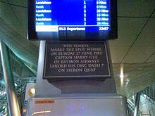 On 27 June 1982 Brymon Captain Harry Gee landed a De Havilland Canada Dash 7 aircraft on Heron Quay to demonstrate the feasibility of the STOLport project, the forerunner to the London City Airport project. A plaque celebrating this achievement lies above the entrance to the DLR station.[2][3]