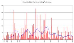 In April 2009, his sixteen One Day International innings since the March 2008 one-day series in Bangladesh having yielded just three fifties, even Stuart Hess, his most ardent media supporter, was moved to cast doubt over his future. Hess had famously recommended Gibbs as captaincy successor to Shaun Pollock in 2003, but now, noting that his "average, as an opener, in that same period is 25.25, more than 10 runs below his overall average of 35.87", Hess felt "a sense that Gibbs is living off past deeds and not playing with the requisite form needed to hold on to a national spot."[17] He noted, however, that Gibbs was the only South African with more than 1,000 World Cup runs and that, of the twelve others, only Sachin Tendulkar with 57.93 and Sir Viv Richards with 63.31 had better averages: