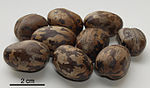 H. brasiliensis is a tall deciduous tree growing to a height of up to 43 m (141 ft) in the wild, but cultivated trees are usually much smaller because drawing off the latex restricts the growth of the tree. The trunk is cylindrical and may have a swollen, bottle-shaped base. The bark is some shade of brown, and the inner bark oozes latex when damaged. The leaves have three leaflets and are spirally arranged. The inflorescence include separate male and female flowers. The flowers are pungent, creamy-yellow and have no petals. The fruit is a capsule that contains three large seeds; it opens explosively when ripe.[1]