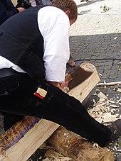 The next step is to chop notches every foot or two, almost as deep as the marked line using a chopping or scoring axe, called scoring. At least three methods are used in scoring. 1) Standing on the log and swinging an axe to chop the score; 2) In Germany a method of two carpenters standing on the ground with the log on trestles and swinging downward to slice the scores. (see video in link below); 3) A chainsaw is used to notch the log, the sections created by the notching are then split off using a felling axe.