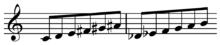 The hexachord as a mnemonic device was first described by Guido of Arezzo, in his Epistola de ignoto cantu.[4] In each hexachord, all adjacent pitches are a whole tone apart, except for the middle two, which are separated by a semitone. These six pitches are named ut, re, mi, fa, sol, and la, with the semitone between mi and fa. These six names are derived from the first syllable of each half-verse of the first stanza of the 8th-century Vesper hymn Ut queant laxis resonare fibris / Mira gestorum famuli tuorum, etc.[5] Melodies with a range wider than a major sixth required the device of mutation to a new hexachord. For example, the hexachord beginning on C and rising to A, named hexachordum naturale, has its only semitone between the notes E and F, and stops short of the note B or B♭. A melody moving a semitone higher than la (namely, from A to the B♭ above) required changing the la to mi, so that the required B♭ becomes fa. Because B♭ was named by the "soft" or rounded letter B, the hexachord with this note in it was called the hexachordum molle (soft hexachord). Similarly, the hexachord with mi and fa expressed by the notes B♮ and C was called the hexachordum durum (hard hexachord), because the B♮ was represented by a squared-off, or "hard" B. Starting in the 14th century, these three hexachords were extended in order to accommodate the increasing use of signed accidentals on other notes.[6]
