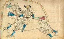 In Lakota mythology, Heyókȟa is also a spirit of thunder and lightning. He is said to use the wind as sticks to beat the drum of thunder. His emotions are portrayed opposite the norm; he laughs when he is sad and cries when he is happy, cold makes him sweat and heat makes him shiver. In art, he is depicted as having two horns, which marks him as a hunting spirit.[6] In some visions, he also appeared as a snow bird, a swallow, a horse, a dog, a night hawk, a frog, or a dragonfly.[7]