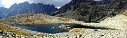 Panorama of High Tatras. Peaks, from left to right: Gerlachovský štít, Batizovský štít, Kačací štít, Končistá, Gánok, Vysoká, and Rysy | |