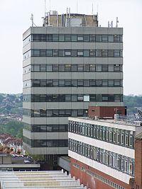 The next building to be completed was the Arts building[32] (now the Law school) and adjoining Nuffield Theatre.[33] Built between 1961 and 1963, the building allowed the Arts faculty to leave the central building for the first time and expand. Adjacent to Arts 1 is the Mathematics tower, built between 1963 and 1965 by Ronald H Sims in the brutalist style and thus is notably different from the buildings around it with exposed concrete.[34] Also around the same time, Oceanography received a new building north of the campus on Burgess Road (now housing part of Electronics and Computer Science since 1996), which was completed in 1965 and designed in brick by the Sheppard Robson Partnership.
