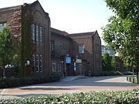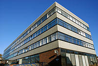 All of these buildings had been constructed on the eastern side of University Road but in 1939 the Western side of the campus was developed with the construction of the West Building in 1939/40.[18] Built on the site of Sir Sidney Kimber's brickyard, the building housed the refectory, common rooms and the Students' Union and was further extended to include an assembly hall, suitable for performances and examinations, in 1948.[19] Following the war, much of the University's capital budget went into purchasing new land, including the brickworks behind the West Building.[19] At the same time the Institute of Education was given its own building in 1948,[20] extensions were made to the Zoology building and the remainder of the Chemistry building completed.[21]