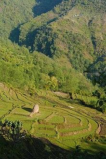 People have both adapted to mountain conditions and modified those conditions.[7] For example, farmers in many areas use terracing to retain soil and water.[5] Contour ploughing also helps stabilize the fragile soil.[8] Often human activity has degraded the mountain environments.[4] Humans have reduced biodiversity in many of the world's mountain regions.[9] Areas with high biodiversity where the environment is under intense stress include California's montane ecoregions (California montane chaparral and woodlands), the mixed forest ecoregion in the Caucasus, and in northwest South America the Magdalena Valley montane forests, Magdalena-Urabá moist forests and Western Ecuador moist forests.[4]